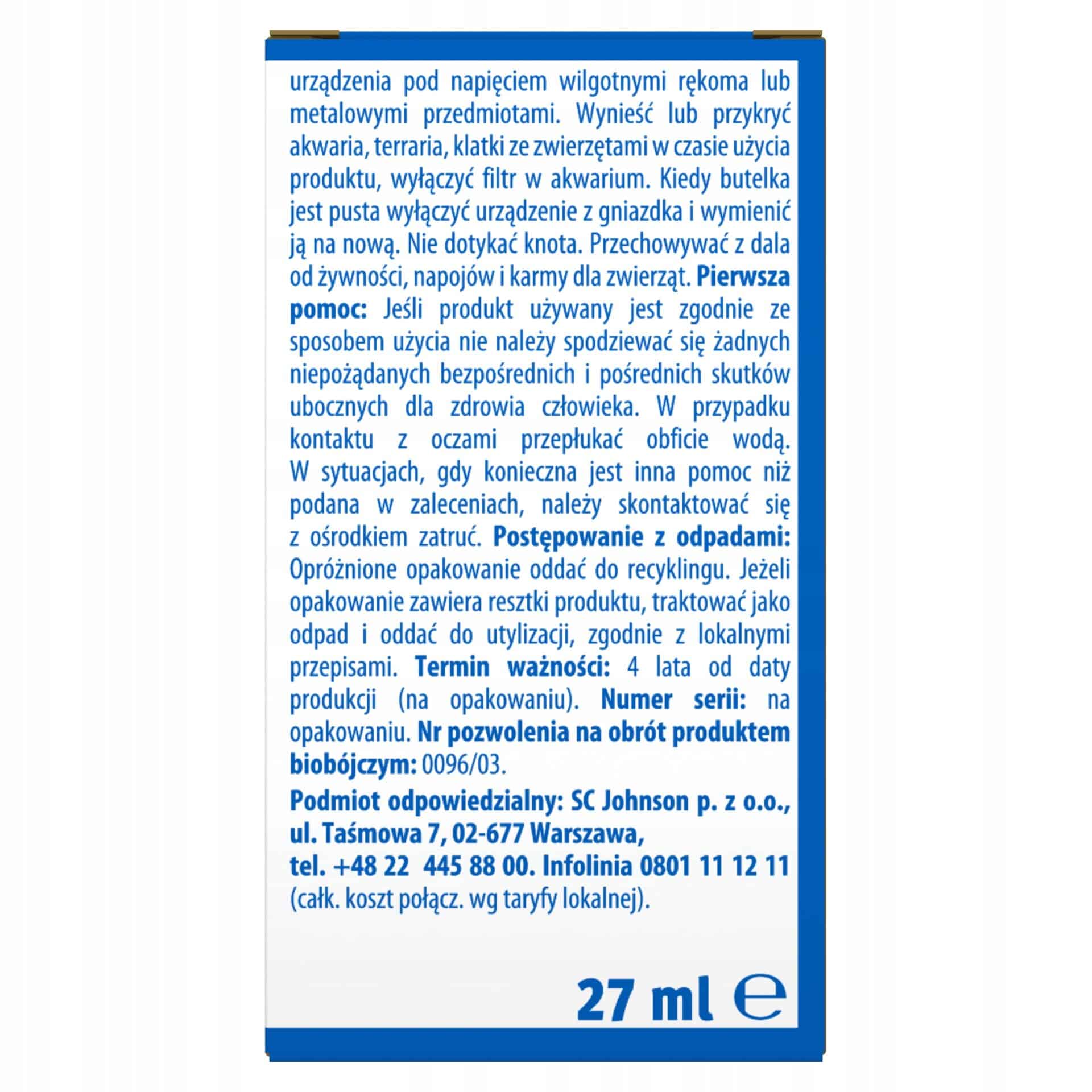 Nie stosować elektrofumigatora dłużej niż 8 godzin w nocy. Produkt podłączony do prądu należy chronić przed ingerencją dzieci i osób szczególnej troski.