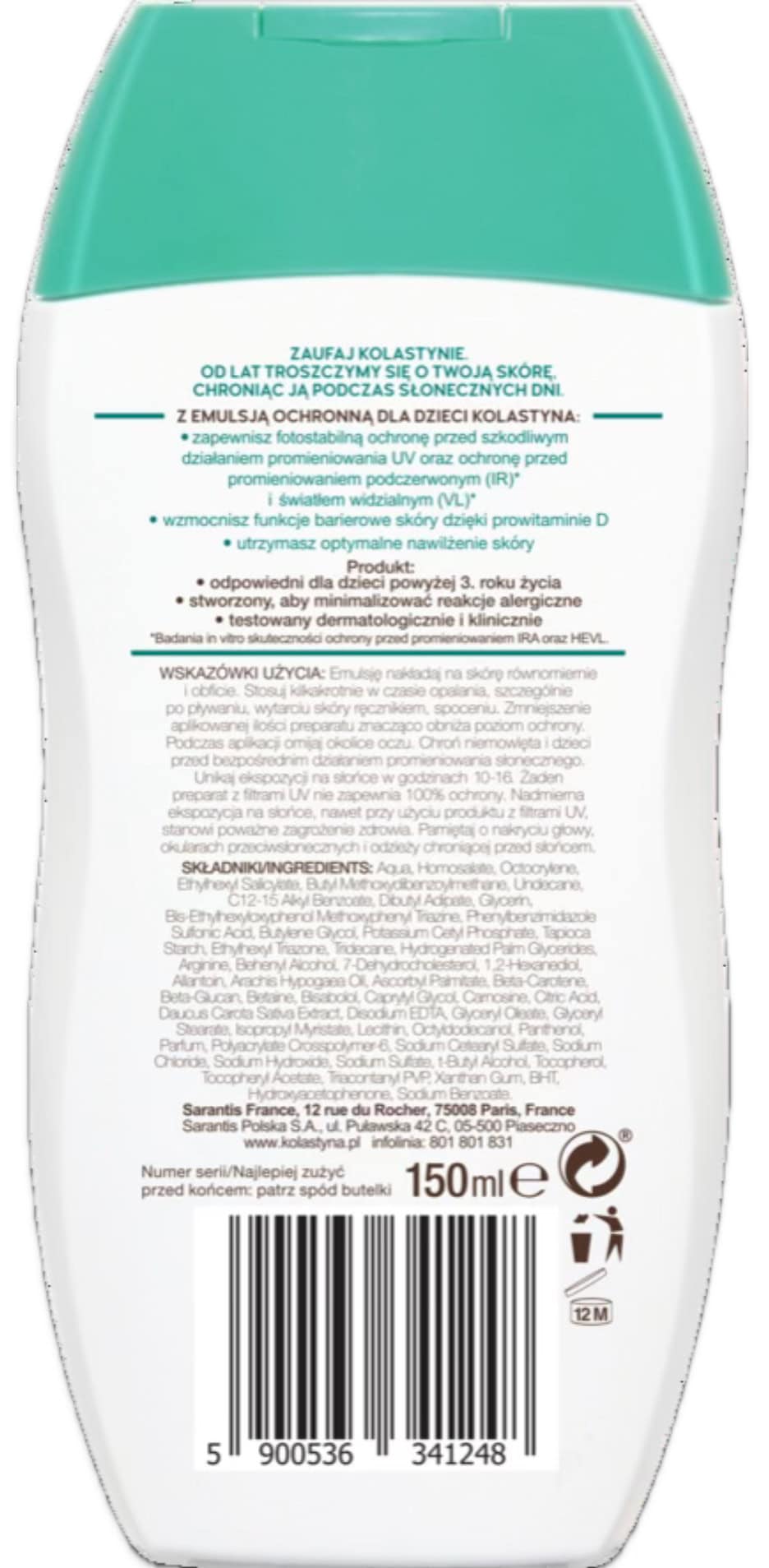 Emulsja do opalania dla dzieci SPF 50 KOLASTYNA została stworzona dla delikatnej skóry dziecka. Oferuje skuteczną i fotostabilną ochronę przed 4 głównymi rodzajami promieniowania (UVA, UVB, światło widzialne, promieniowanie podczerwone), które przyczyniają się do poparzenia słonecznego oraz powstawania wolnych rodników odpowiedzialnych za przedwczesne starzenie oraz fotostarzenie skóry.
