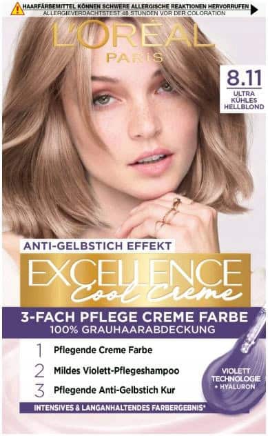 Dzięki koloryzacji w odcieniu Cool 8.11 Light Blonde od L’Oréal Paris Excellence uzyskasz ultra-chłodny kolor włosów dzięki innowacyjnej fioletowej formule. Barwniki fioletowe przeciwdziałają ciepłym tonom, które mogą powstać podczas barwienia. Nowa pielęgnacja fioletu zapewnia długotrwały, chłodny efekt kolorystyczny nawet po koloryzacji. Łagodny fioletowy szampon delikatnie oczyszcza skórę głowy i włosy z nadmiaru pozostałości koloru oraz wygładza powierzchnię włosów. Bogaty, fioletowy balsam pielęgnacyjny neutralizuje niepożądane kolory i utrzymuje chłodny efekt kolorystyczny.