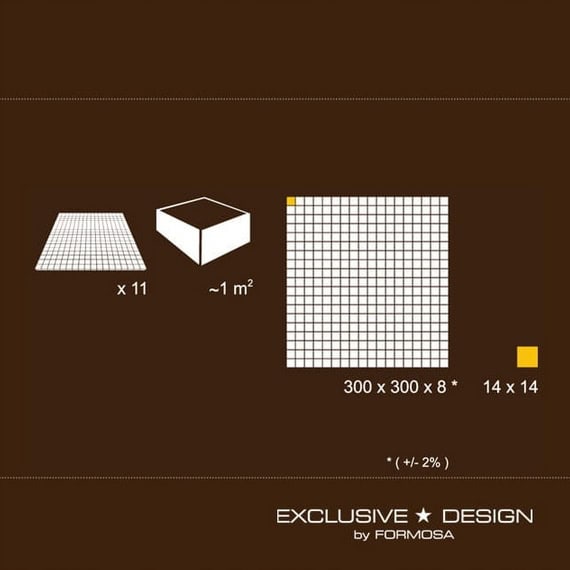 Z portfolio EXCLUSIVE design by Formosa to wyjątkowo dekoracyjny, a zarazem wysoce funkcjonalny i ekskluzywny element wykończenia wnętrz. Piękno mozaik szklanych wydobywać można na niezliczoną ilość sposobów, przede wszystkim dzięki wielości form, w jakich owe mozaiki występują. EXCLUSIVE design by Formosa nieustannie rozbudowuje mozaikowe portfolio, które charakteryzuje nadzwyczaj bogata paleta kolorystyczna i różnorodność stylów, od klasycznych mozaik szklanych po wzornictwo nowoczesne. Do wyboru mamy kilkanaście kolorów, które dodatkowo zamknięto w różnego rodzaju elementach. Mamy do wyboru płytki z malutkimi kwadracikami, z kwadratami o boku ok. 5 cm, z cienkimi prostokątami ułożonymi w trzech rzędach czy też płytki, których elementy to kwadraty i prostokąty o znacznie większych rozmiarach ułożone nieregularnie. To także płytki ,w których elementy są gładkie lub posiadają różne struktury, które odpowiednio oświetlone dadzą niespotykany efekt. Płytki nie są rektyfikowane.